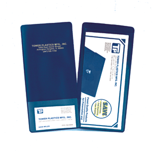 Navy Blue vinyl. Also included is a business card pocket. Free Imprinting when all pieces printed the same.
